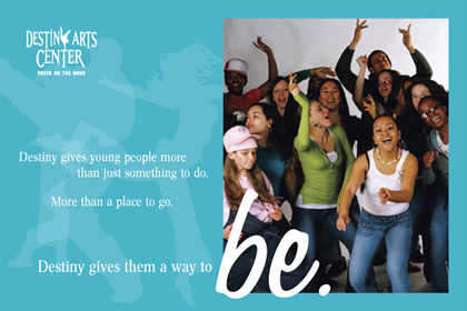 This thriving non-profit arts organization provides dance, martial arts, and violence prevention training to Oakland youth from all walks of life. Their brochure needed to work for several different audiences, and my strategy was to emphasize that along with dance and karate, Destiny provides kids with new ways to approach life.